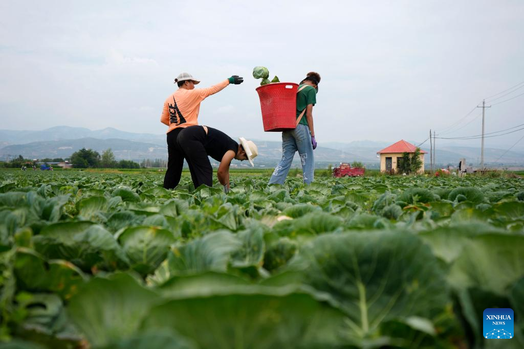Staff members harvest cabbage at a cool-season vegetable base in Guyuan, northwest China's Ningxia Hui Autonomous Region, July 18, 2025. Leveraging its high-altitude terrain and cold-weather advantages, Guyuan has vigorously developed its cool-season vegetable industry in recent years. (Xinhua/Wang Peng)