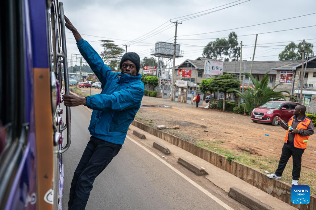 A matatu conductor jumps on the vehicle after departure in Nairobi, Kenya, on July 18, 2025.