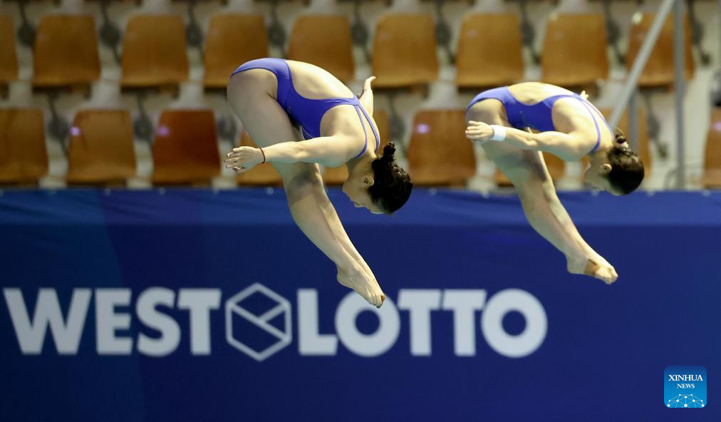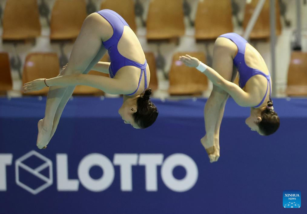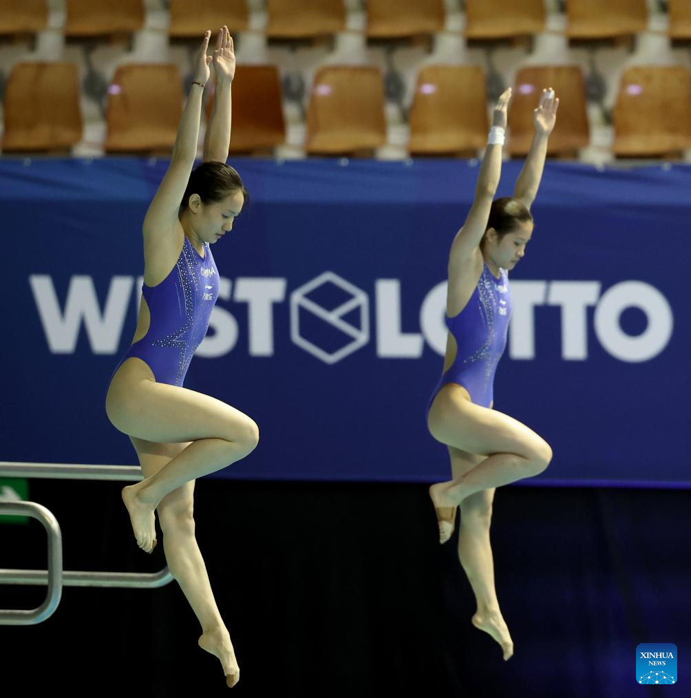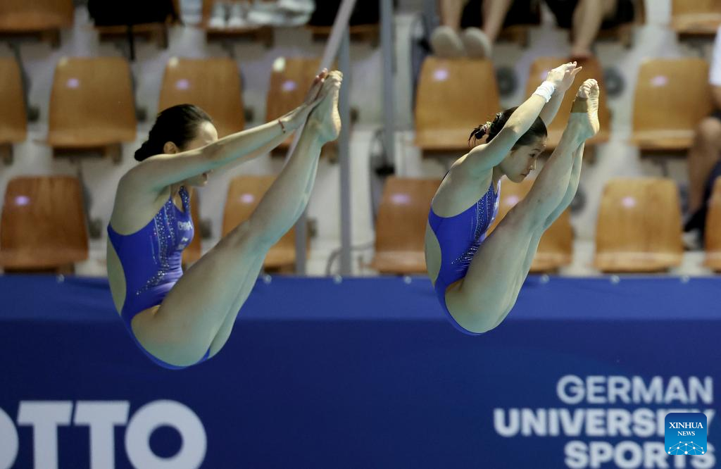 Ouyang Yu (L)/Wang Weiying of China compete during the women's synchronised 3m springboard final of diving at the Rhine-Ruhr 2025 FISU World University Games in Berlin, Germany, July 18, 2025. (Xinhua/Li Ying)