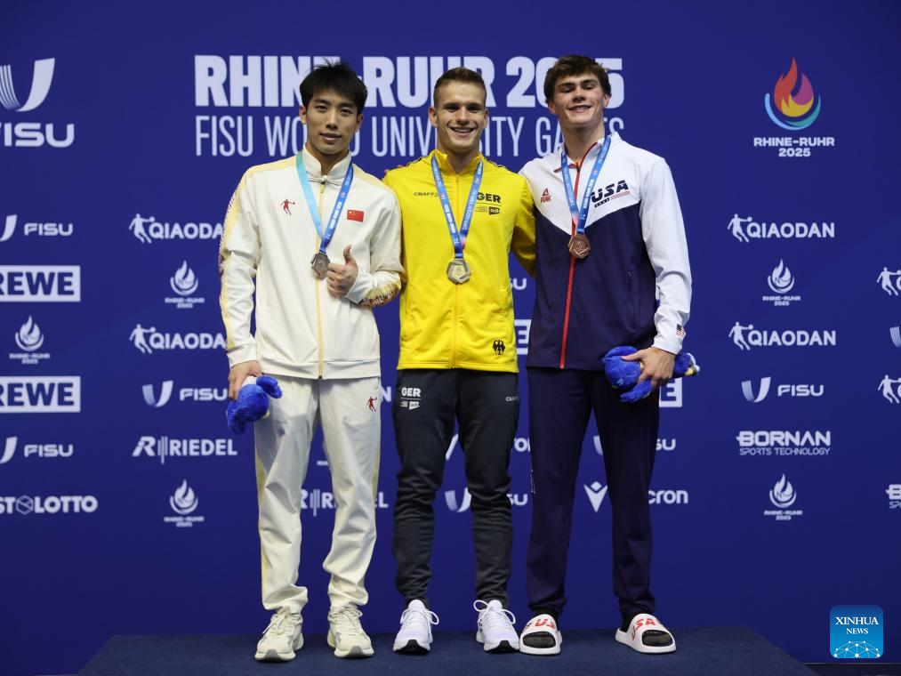 Gold medalist Moritz Wesemann (C) of Germany, sliver medalist Hu Yukang (L) of China and bronze medalist Luke Alexander Sitz of the United States pose during the awarding ceremony for the men's 3m springboard final of diving at the Rhine-Ruhr 2025 FISU World University Games in Berlin, Germany, July 18, 2025. (Xinhua/Du Zheyu)