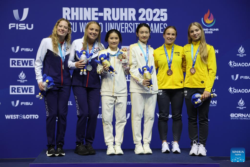 Gold medalists Ouyang Yu/Wang Weiying of China (C), silver medalists Lanie Lynn Gutch/Eliana Claire Joyce of the United States (L) and bronze medalists Lena Hentschel/Jette Muller of Germany pose during the awarding ceremony for the women's synchronised 3m springboard final of diving at the Rhine-Ruhr 2025 FISU World University Games in Berlin, Germany, July 18, 2025. (Xinhua/Du Zheyu)