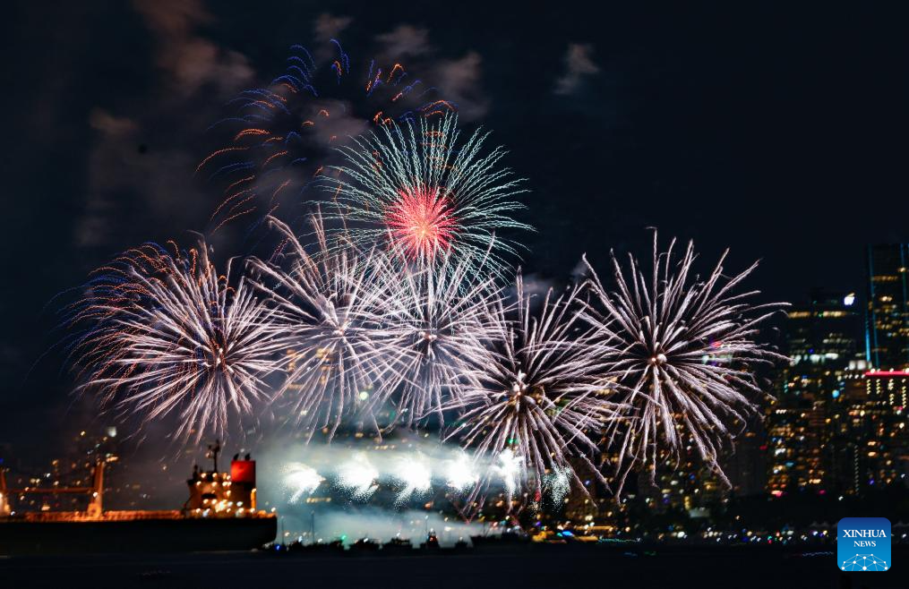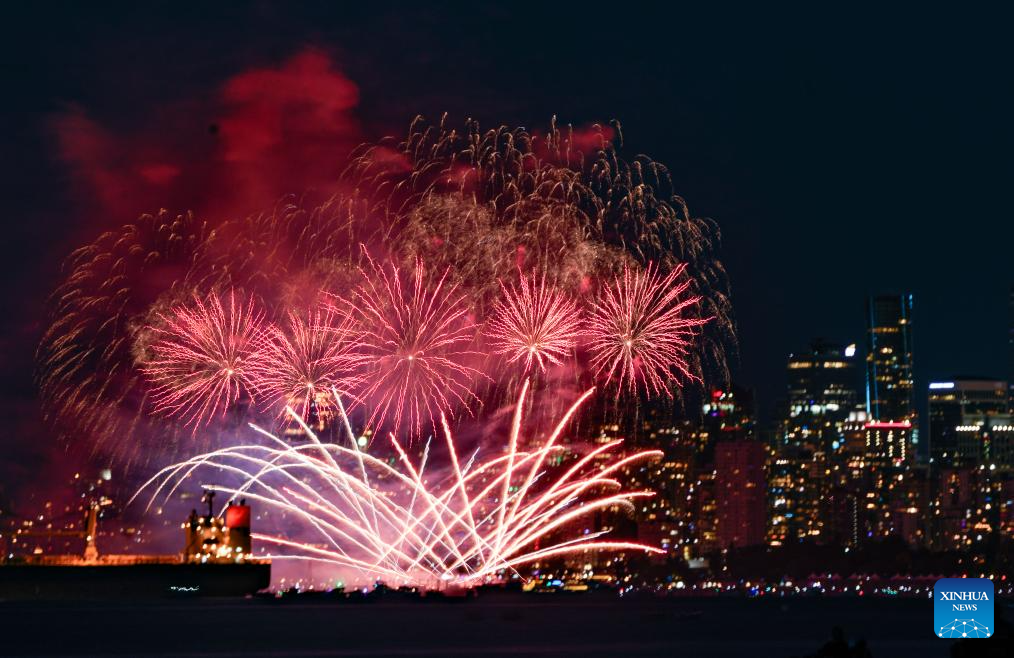 Fireworks light up the sky during the 2025 Celebration of Light at English Bay in Vancouver, British Columbia, Canada, July 19, 2025. The 33rd Celebration of Light fireworks show kicked off here Saturday. This year's event features an all-Canadian lineup, with pyrotechnic teams from Yukon, Quebec, and Nova Scotia scheduled to perform on July 19, 23, and 26, respectively. (Photo by Liang Sen/Xinhua)