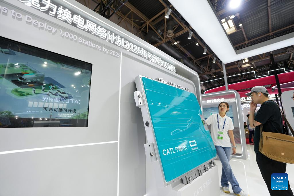 A man visits the booth of Contemporary Amperex Technology (CATL) in the Smart Vehicle Chain area of the third China International Supply Chain Expo (CISCE) in Beijing, capital of China, July 19, 2025. At the Smart Vehicle Chain area of the third CISCE, more than 30 domestic and foreign enterprises and institutions showcased key technologies and products of the EV industry chain, demonstrating the achievements of the collaborative innovation in the sector.