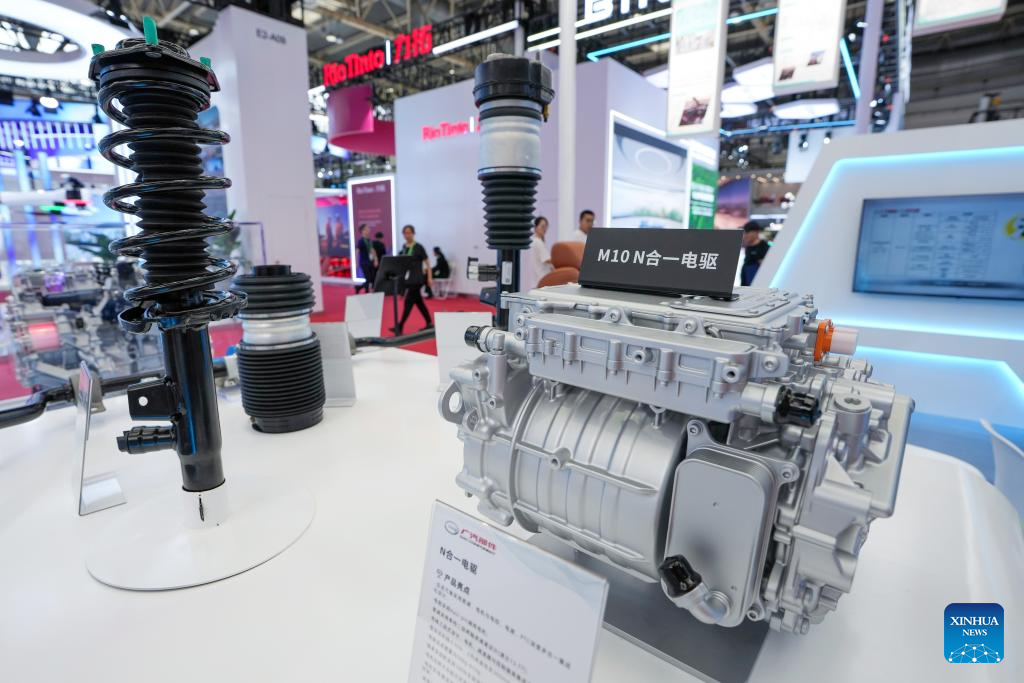 This photo take on July 19, 2025 shows an electric drive system at the booth of GAC Component Co., Ltd. in the Smart Vehicle Chain area of the third China International Supply Chain Expo (CISCE) in Beijing, capital of China. At the Smart Vehicle Chain area of the third CISCE, more than 30 domestic and foreign enterprises and institutions showcased key technologies and products of the EV industry chain, demonstrating the achievements of the collaborative innovation in the sector.