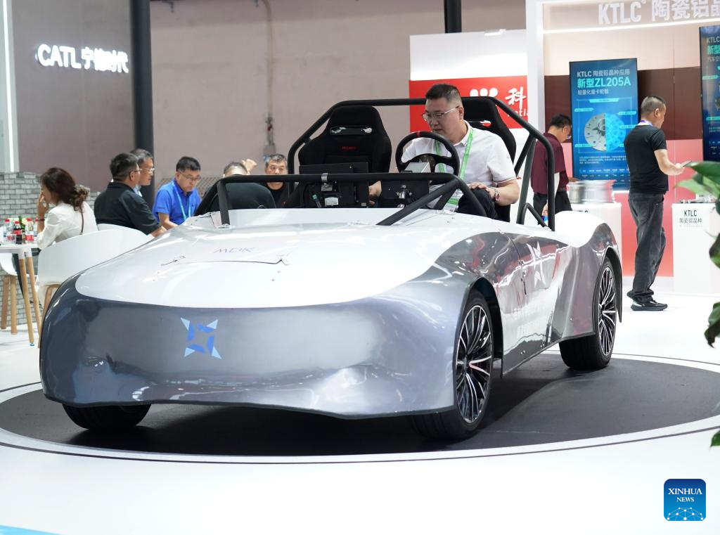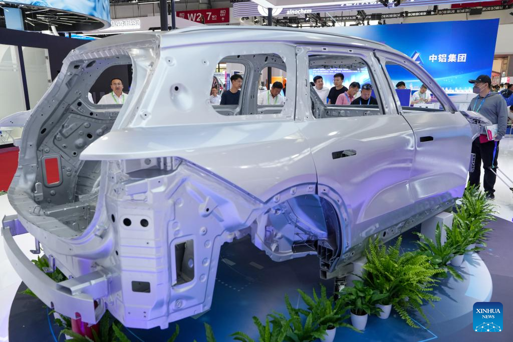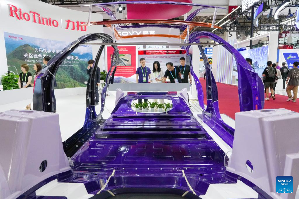 People visit the booth of Aluminum Corporation of China in the Advanced Manufacturing Chain area of the third China International Supply Chain Expo (CISCE) in Beijing, capital of China, July 16, 2025. At the Smart Vehicle Chain area of the third CISCE, more than 30 domestic and foreign enterprises and institutions showcased key technologies and products of the EV industry chain, demonstrating the achievements of the collaborative innovation in the sector.
