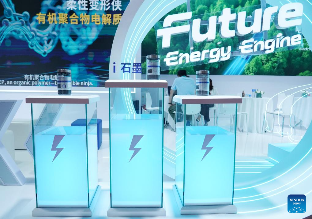 This photo taken on July 18, 2025 shows battery materials displayed at the Smart Vehicle Chain area of the third China International Supply Chain Expo (CISCE) in Beijing, capital of China. At the Smart Vehicle Chain area of the third CISCE, more than 30 domestic and foreign enterprises and institutions showcased key technologies and products of the EV industry chain, demonstrating the achievements of the collaborative innovation in the sector.