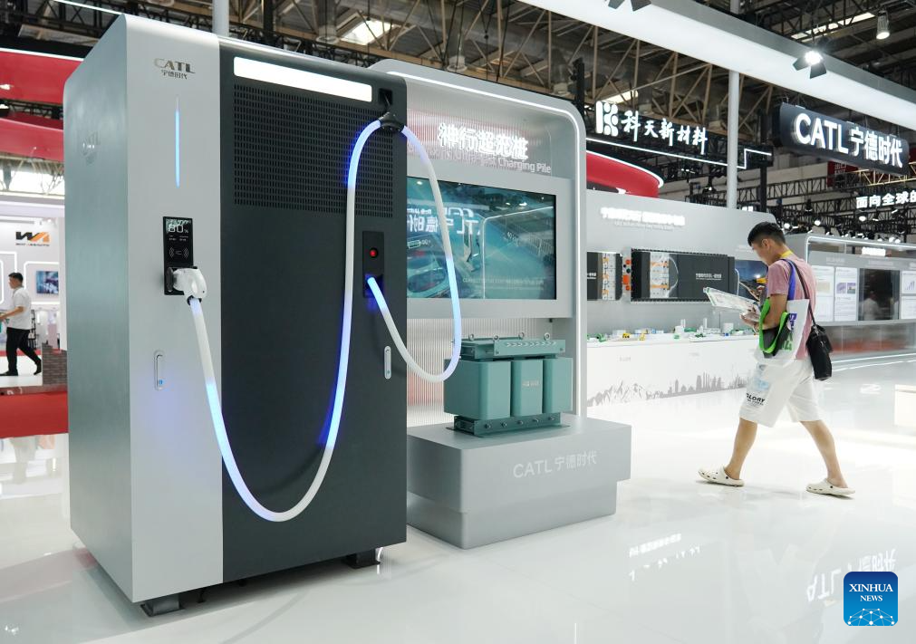 A Shenxing ultra-fast charging pile is pictured at the booth of Contemporary Amperex Technology (CATL) in the Smart Vehicle Chain area of the third China International Supply Chain Expo (CISCE) in Beijing, capital of China, July 18, 2025. At the Smart Vehicle Chain area of the third CISCE, more than 30 domestic and foreign enterprises and institutions showcased key technologies and products of the EV industry chain, demonstrating the achievements of the collaborative innovation in the sector.