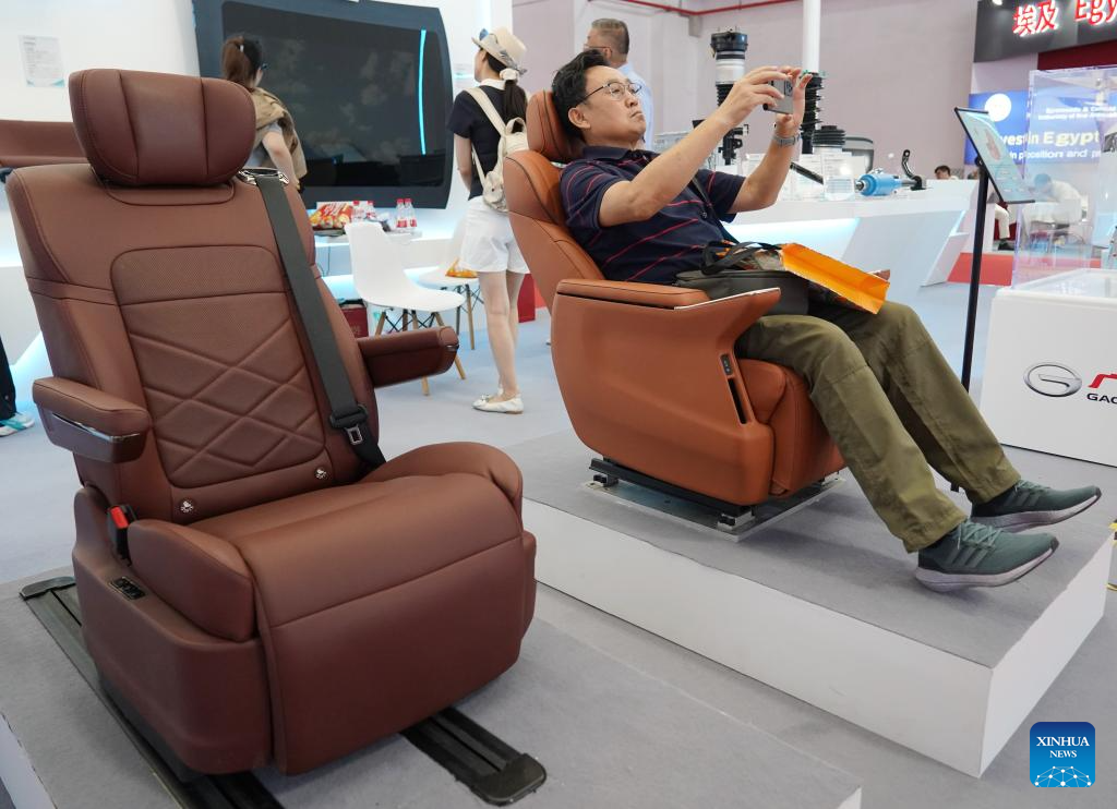 A visitor tries a zero-pressure ergonomic car chair at the Smart Vehicle Chain area of the third China International Supply Chain Expo (CISCE) in Beijing, capital of China, July 18, 2025. At the Smart Vehicle Chain area of the third CISCE, more than 30 domestic and foreign enterprises and institutions showcased key technologies and products of the EV industry chain, demonstrating the achievements of the collaborative innovation in the sector.