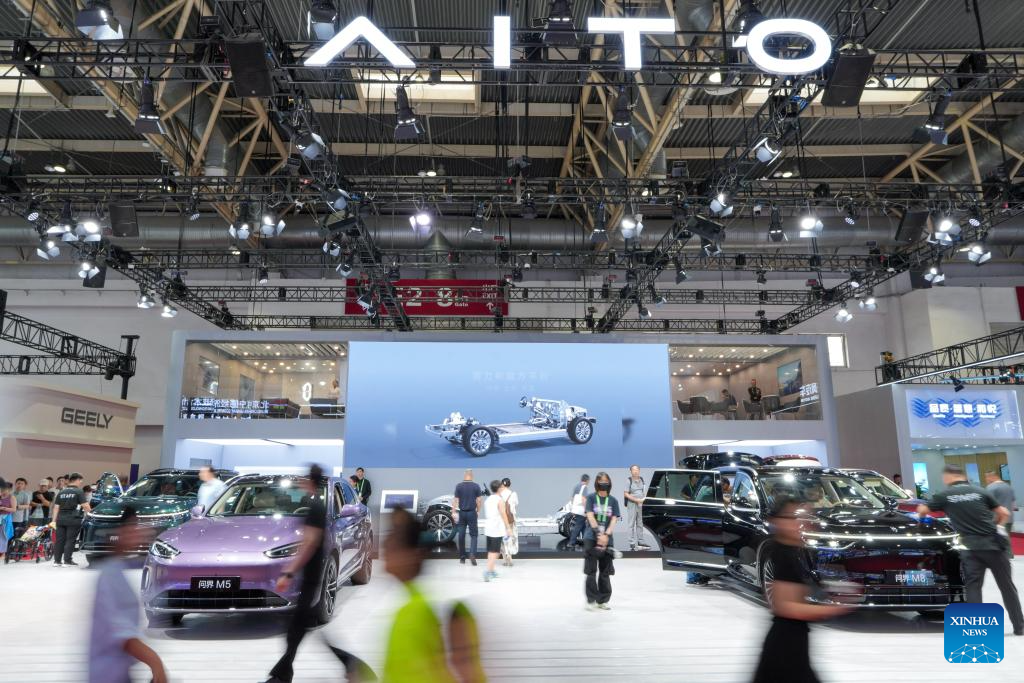People visit the booth of AITO in the Smart Vehicle Chain area of the third China International Supply Chain Expo (CISCE) in Beijing, capital of China, July 19, 2025. At the Smart Vehicle Chain area of the third CISCE, more than 30 domestic and foreign enterprises and institutions showcased key technologies and products of the EV industry chain, demonstrating the achievements of the collaborative innovation in the sector.