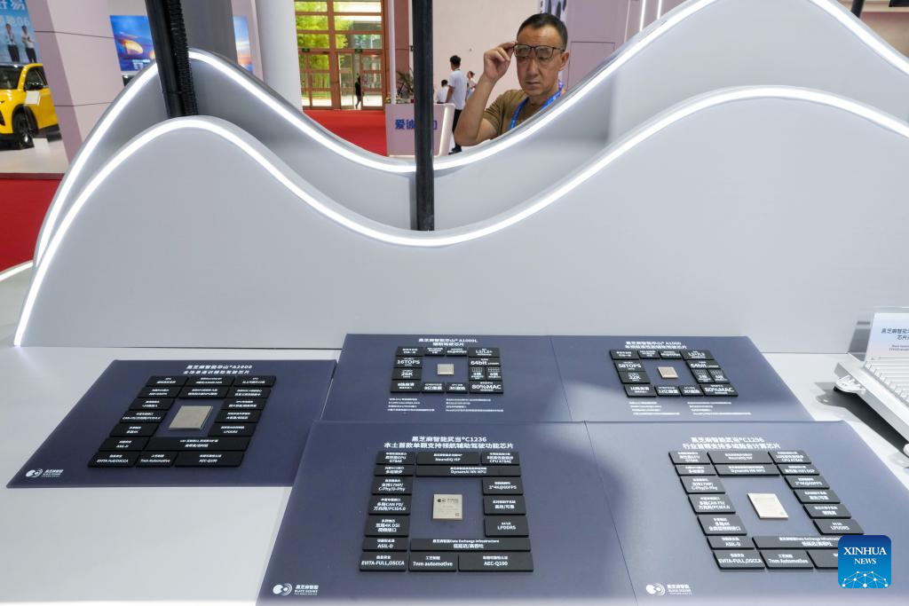 A visitor views chips of driver assistance system at the booth of Black Sesame Technologies at in the Smart Vehicle Chain area of the third China International Supply Chain Expo (CISCE) in Beijing, capital of China, July 19, 2025. At the Smart Vehicle Chain area of the third CISCE, more than 30 domestic and foreign enterprises and institutions showcased key technologies and products of the EV industry chain, demonstrating the achievements of the collaborative innovation in the sector.