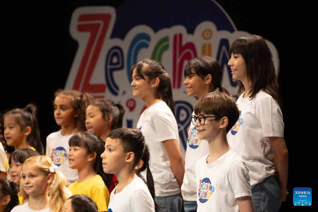 Children from the Little Choir of Antoniano and the Hydrangea Children's Choir prepare for the performance in Bologna, Italy, July 18, 2025. The Antoniano Institute in Bologna hosted a special joint performance on Friday, featuring children from the Little Choir of Antoniano from Italy and the Hydrangea Children's Choir from China. The performance was a highlight of the Antoniano Summer Camp 2025, a ten-day cultural and musical exchange co-organized by the two choirs. Guided by Antoniano's teachers, 22 children from China and their Italian peers connected through rehearsals, music games and hands-on activities. (Xinhua/Li Jing)
