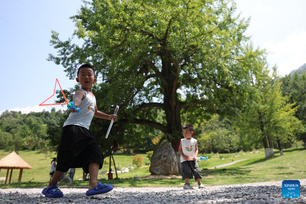 Children play under a thousand-year-old ginkgo tree at Tianhe Village, Jialing Town of Huixian County, northwest China's Gansu Province, on July 15, 2025. (Xinhua/Chen Bin)