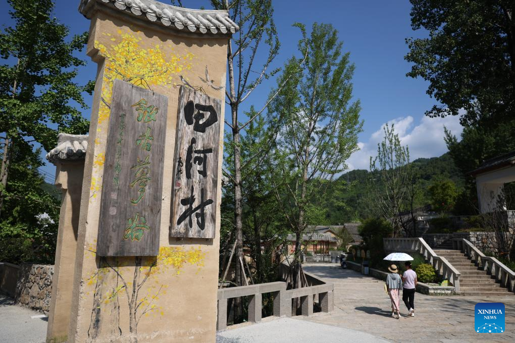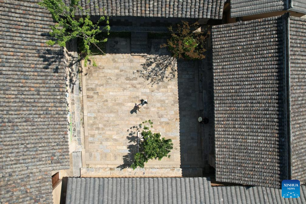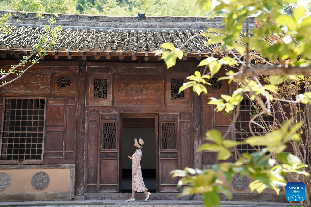 A tourist visits an ancient courtyard at Tianhe Village, Jialing Town of Huixian County, northwest China's Gansu Province, on July 15, 2025. Located on the banks of Jialing River, Tianhe Village of Huixian County is home to 153 thousand-year-old ginkgo trees, thanks to its warm and humid weather that provides excellent conditions for the growth and reproduction of the trees.
