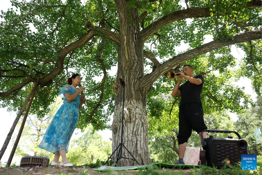 Tourists Gong Xihua (L) and Zhao Weidong livestream singing and music playing under a thousand-year-old ginkgo tree at Tianhe Village, Jialing Town of Huixian County, northwest China's Gansu Province, on July 15, 2025. (Xinhua/Chen Bin)