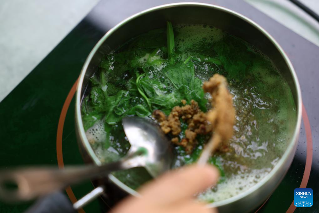 Villager Yang Li makes a local specialty tea drink for tourists in her own yard at Tianhe Village, Jialing Town of Huixian County, northwest China's Gansu Province, on July 15, 2025. (Xinhua/Chen Bin)