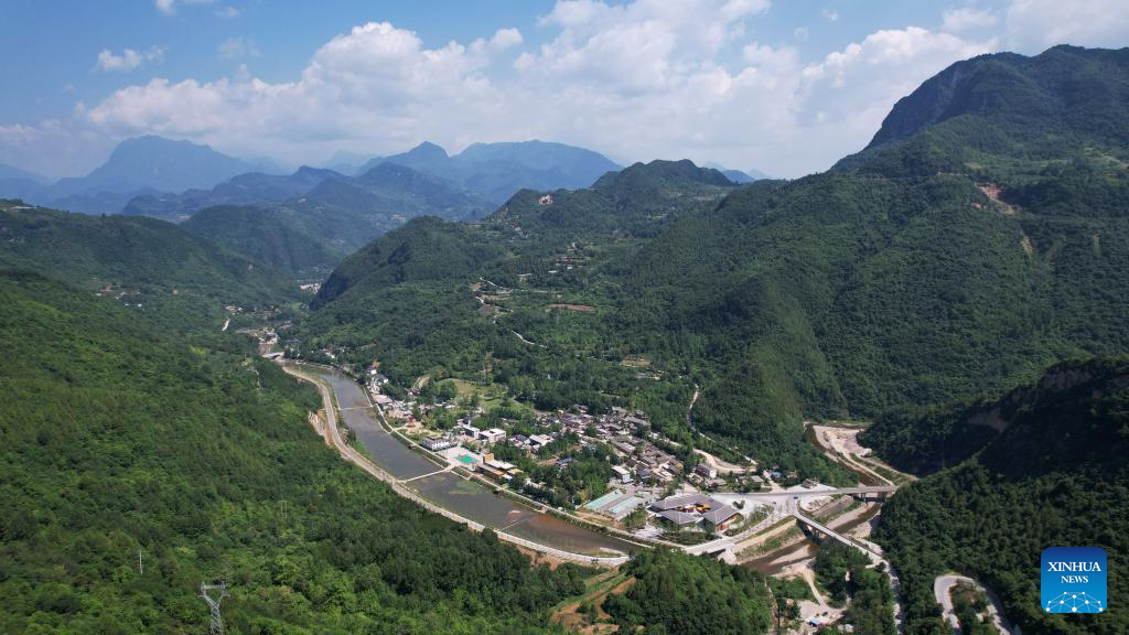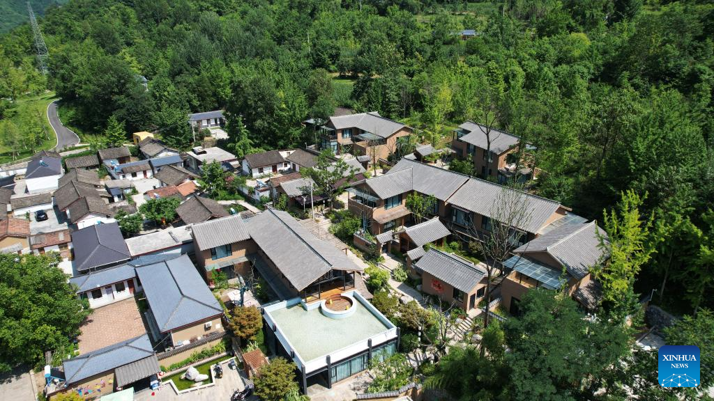 An aerial drone photo taken on July 15, 2025 shows a homestay at Tianhe Village, Jialing Town of Huixian County, northwest China's Gansu Province. (Xinhua/Chen Bin)