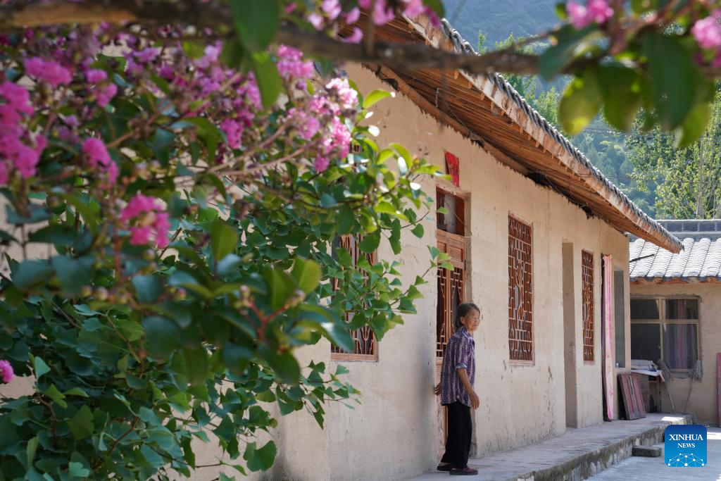 A villager is pictured in her own yard at Tianhe Village, Jialing Town of Huixian County, northwest China's Gansu Province, on July 15, 2025. (Xinhua/Ma Ning)