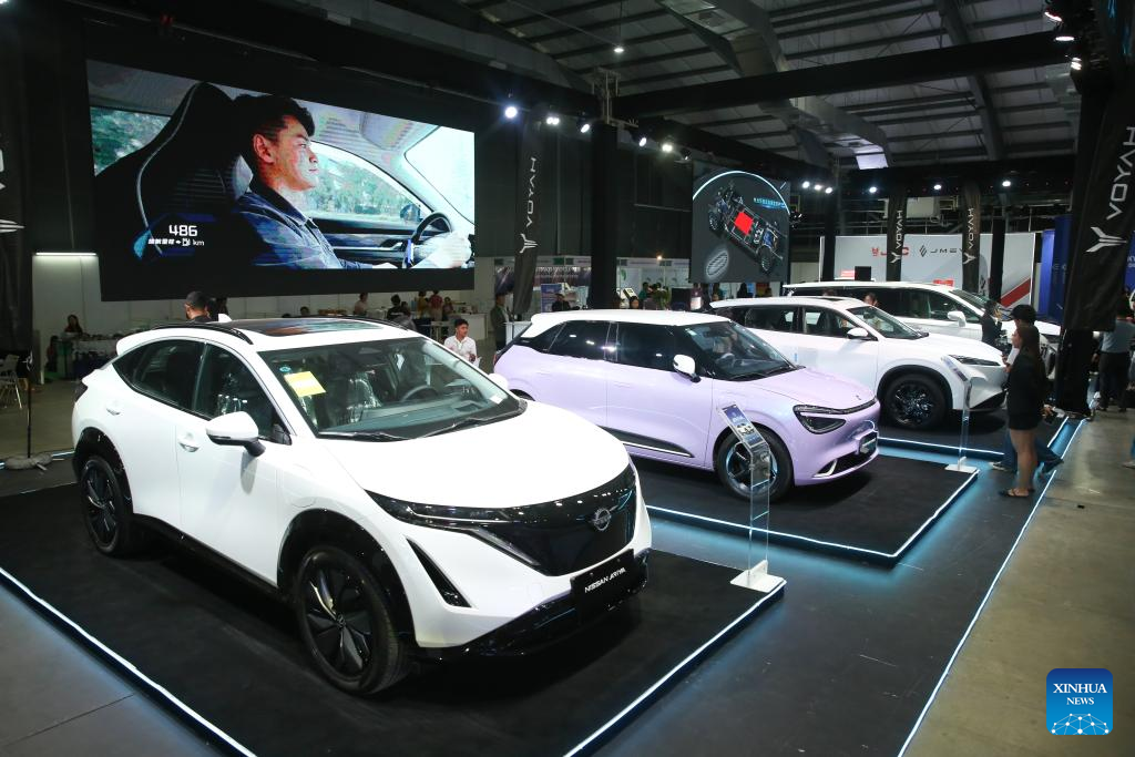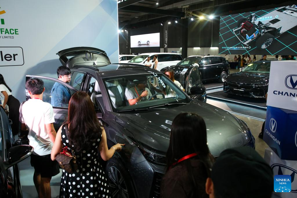People visit the exhibition area of the Myanmar International Auto Expo 2025 in Yangon, Myanmar, July 18, 2025. The three-day Myanmar International Auto Expo 2025, held from Friday to Sunday, brought together over 30 brands, most of them Chinese.(Xinhua/Myo Kyaw Soe)