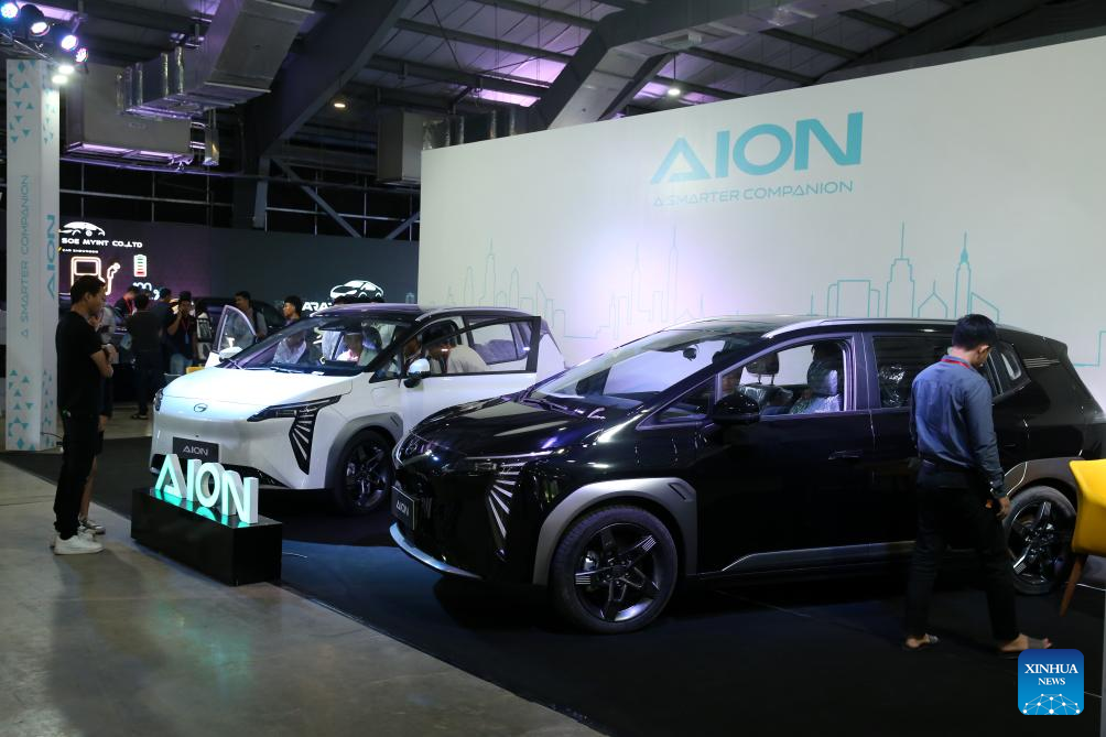 People visit the booth of Aion during the Myanmar International Auto Expo 2025 in Yangon, Myanmar, July 18, 2025. The three-day Myanmar International Auto Expo 2025, held from Friday to Sunday, brought together over 30 brands, most of them Chinese.(Xinhua/Myo Kyaw Soe)