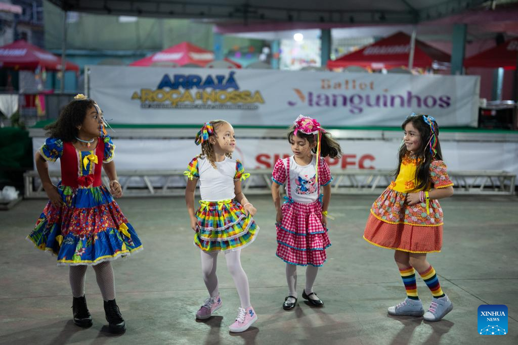 Children dance together during a celebration of harvest in the Manguinhos community in Rio de Janeiro, Brazil, July 19, 2025. (Xinhua/Wang Tiancong)