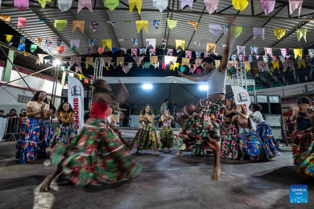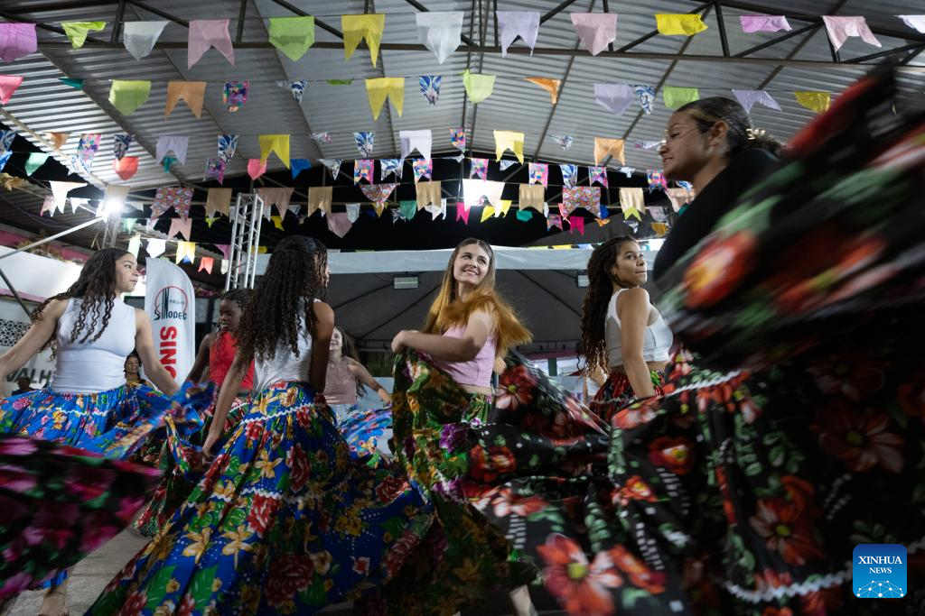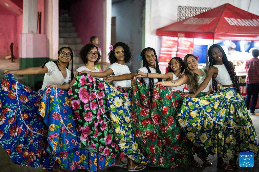 Dancers perform during a celebration of harvest in the Manguinhos community in Rio de Janeiro, Brazil, July 19, 2025. (Xinhua/Wang Tiancong)