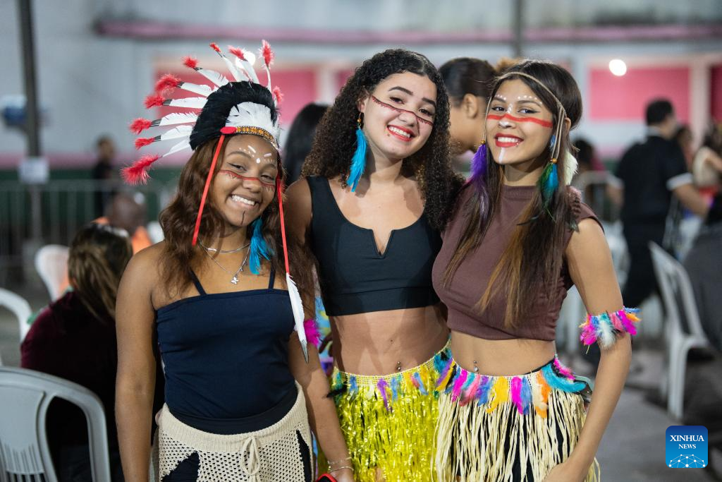 Participants perform a traditional group dance during a celebration of harvest in the Manguinhos community in Rio de Janeiro, Brazil, July 19, 2025. (Xinhua/Wang Tiancong)