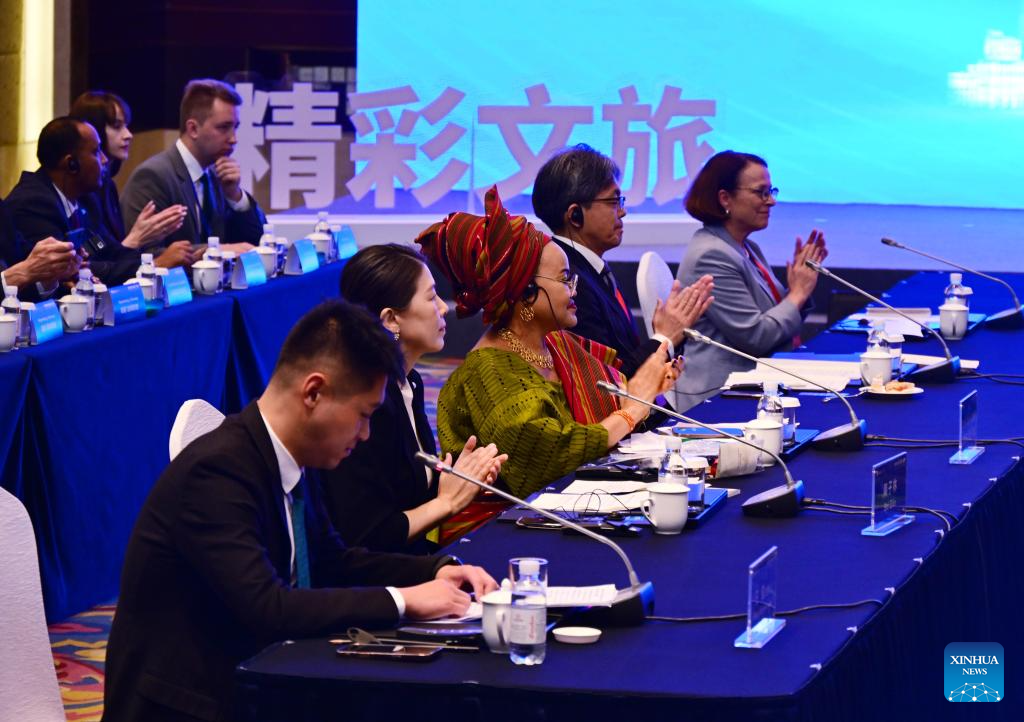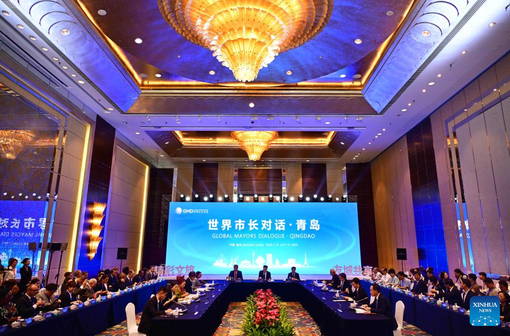Guests exchange views at the "Global Mayors Dialogue, Qingdao" during the Qingdao International Friendship Cities Exchange Month in Qingdao, east China's Shandong Province, July 19, 2025. Qingdao International Friendship Cities Exchange Month opened here on Saturday, bringing together representatives of 19 cities and institutions from 17 countries, aiming to expand the cultural and tourism exchanges and explore paths for industrial cooperation. (Xinhua/Li Ziheng)
