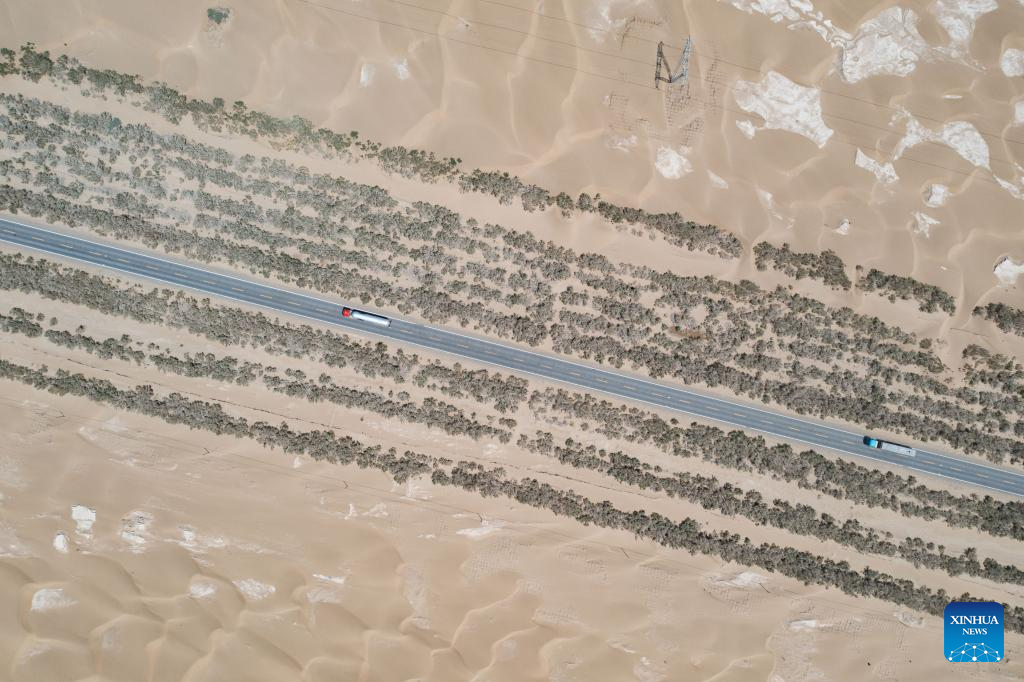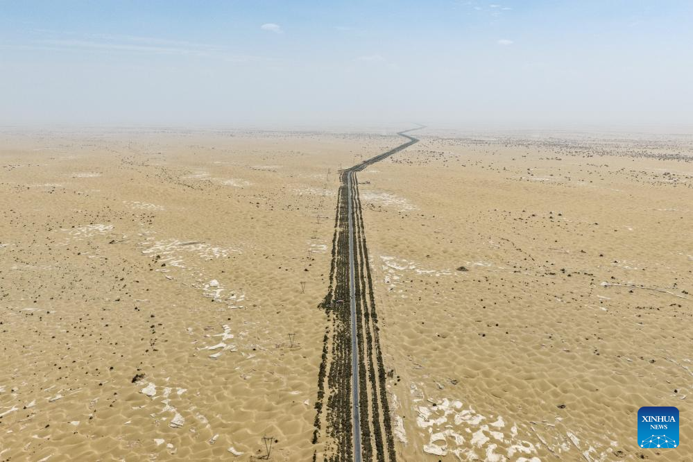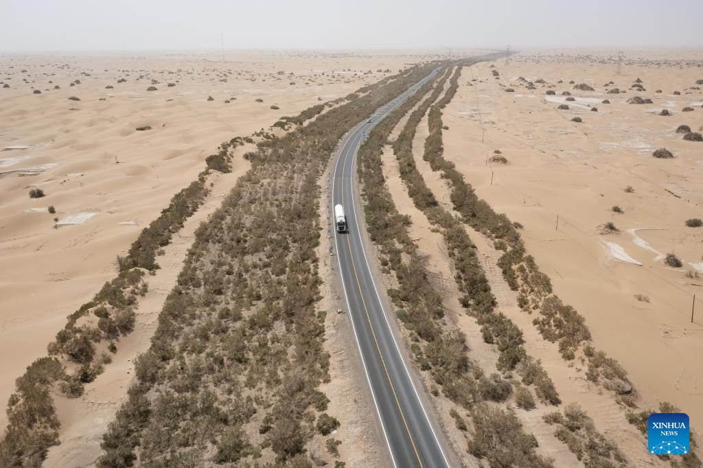 An aerial drone photo taken on July 18, 2025 shows a section of the Tarim Desert Highway and the shelterbelt planted along it in northwest China's Xinjiang Uygur Autonomous Region. The 522-km highway runs across the Taklimakan Desert, the world's second-largest shifting sand desert. (Xinhua/Meng Tao)