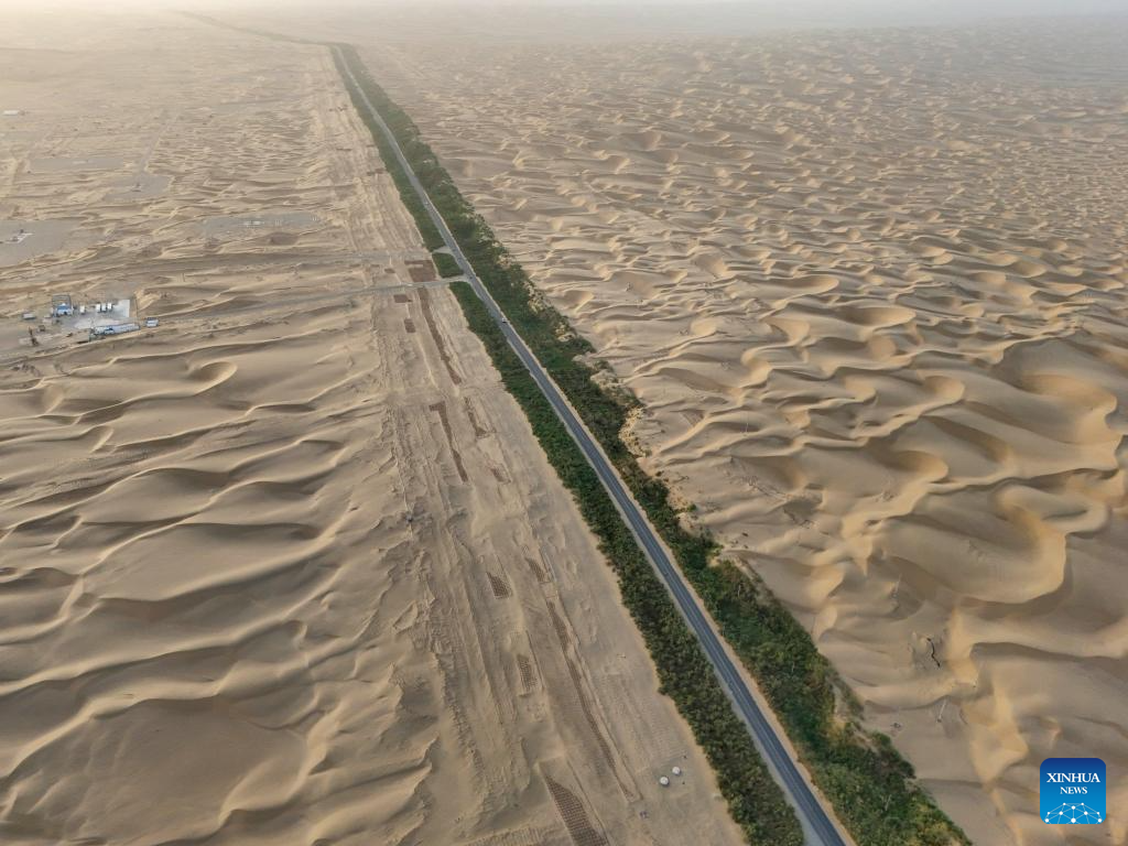 An aerial drone photo taken on July 18, 2025 shows the Tarim Desert Highway traversing through the Taklimakan Desert and the shelterbelt planted along it in northwest China's Xinjiang Uygur Autonomous Region. The 522-km highway runs across the Taklimakan Desert, the world's second-largest shifting sand desert. (Xinhua/Zhang Keren)
