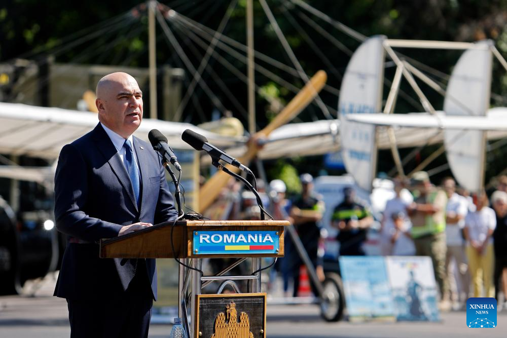 Romanian Prime Minister Ilie Bolojan delivers a speech during celebrations of the Romanian Aviation and Air Force Day in Bucharest, Romania, July 20, 2025. (Photo by Cristian Cristel/Xinhua)
