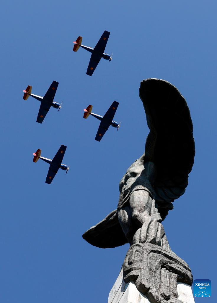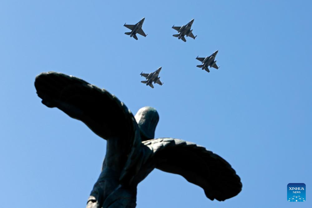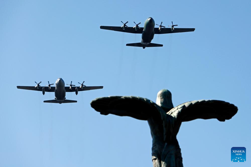 Military airplanes fly over the Statue of Air Heroes during celebrations of the Romanian Aviation and Air Force Day in Bucharest, Romania, July 20, 2025. (Photo by Cristian Cristel/Xinhua)