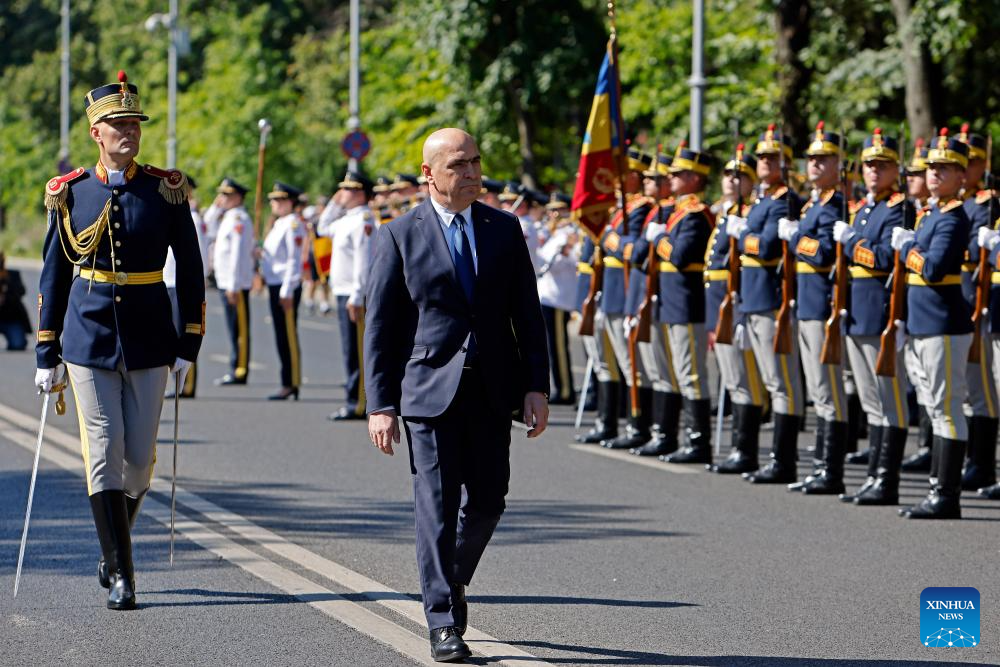 Romanian Prime Minister Ilie Bolojan inspects the guard of honor during celebrations of the Romanian Aviation and Air Force Day in Bucharest, Romania, July 20, 2025. (Photo by Cristian Cristel/Xinhua)