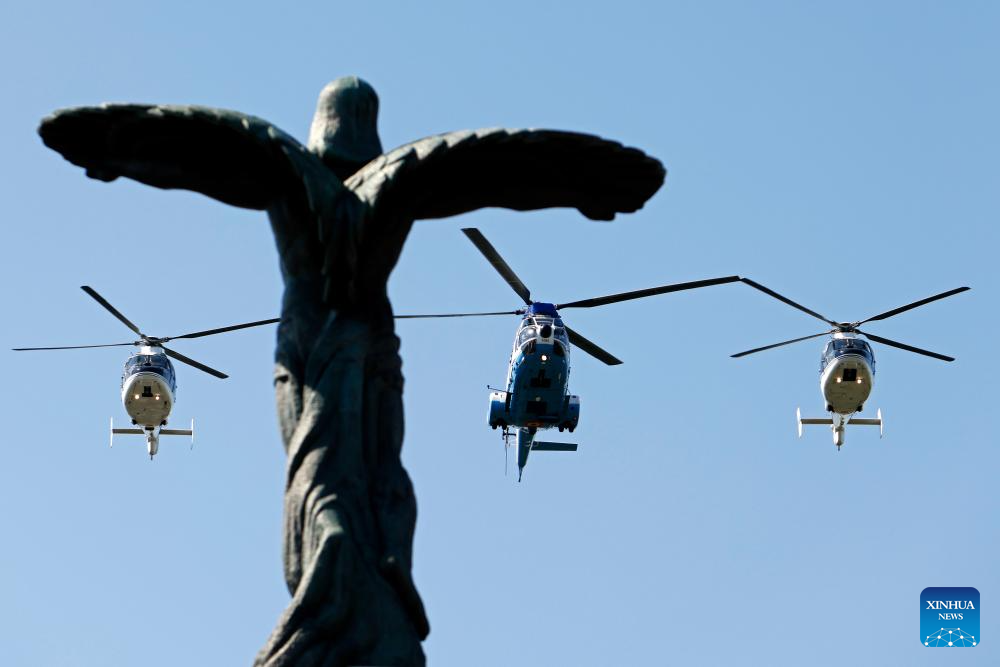 Military helicopters fly over the Statue of Air Heroes during celebrations of the Romanian Aviation and Air Force Day in Bucharest, Romania, July 20, 2025. (Photo by Cristian Cristel/Xinhua)