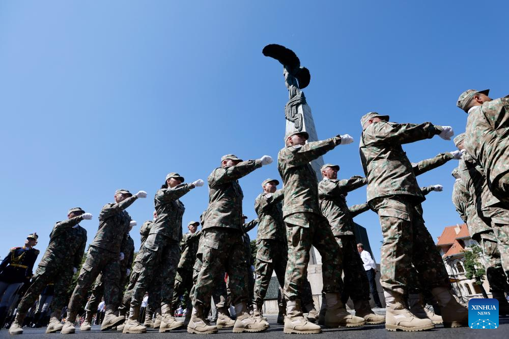 Soldiers attend celebrations of the Romanian Aviation and Air Force Day in front of the Statue of Air Heroes in Bucharest, Romania, July 20, 2025. (Photo by Cristian Cristel/Xinhua)