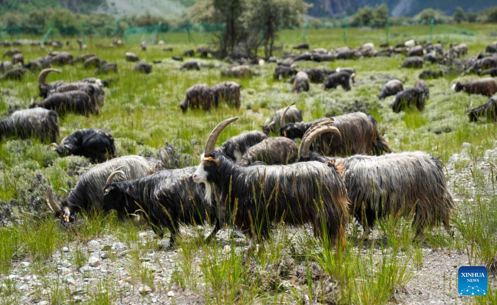 The constant flow of glacial meltwater and rich medicinal herb resources make the county of Banbar an ideal place to raise black goats. Since 2016, about 11.96 million yuan (1.67 million U.S. dollars) has been invested here in black goat breeding, with more than 6,200 breeding goats in stock. (Xinhua/Jigme Dorje)