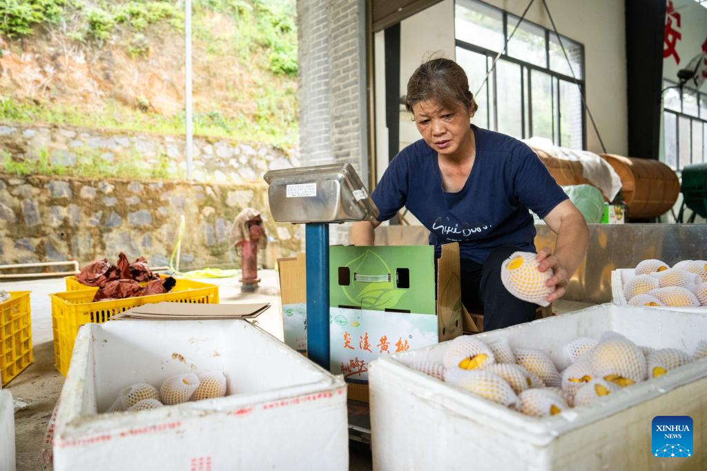 A farmer packs yellow peaches in Shiziba Village of Yanling County, Zhuzhou, central China's Hunan Province, July 21, 2025. Yellow peaches in Yanling County have entered harvest season. Yellow peach is the characteristic industry of Yanling, which boasts a planting area of about 96,000 mu (6400 hectares) with an expected output of 85,000 tonnes this year. (Xinhua/Chen Sihan)