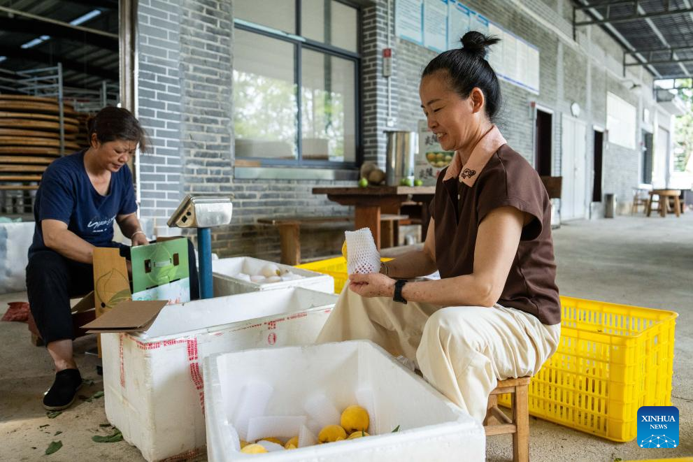 Farmers pack yellow peaches in Shiziba Village of Yanling County, Zhuzhou, central China's Hunan Province, July 21, 2025. Yellow peaches in Yanling County have entered harvest season. Yellow peach is the characteristic industry of Yanling, which boasts a planting area of about 96,000 mu (6400 hectares) with an expected output of 85,000 tonnes this year. (Xinhua/Chen Sihan)