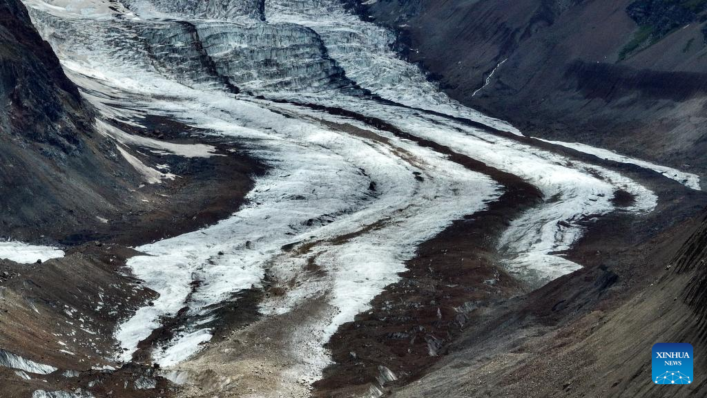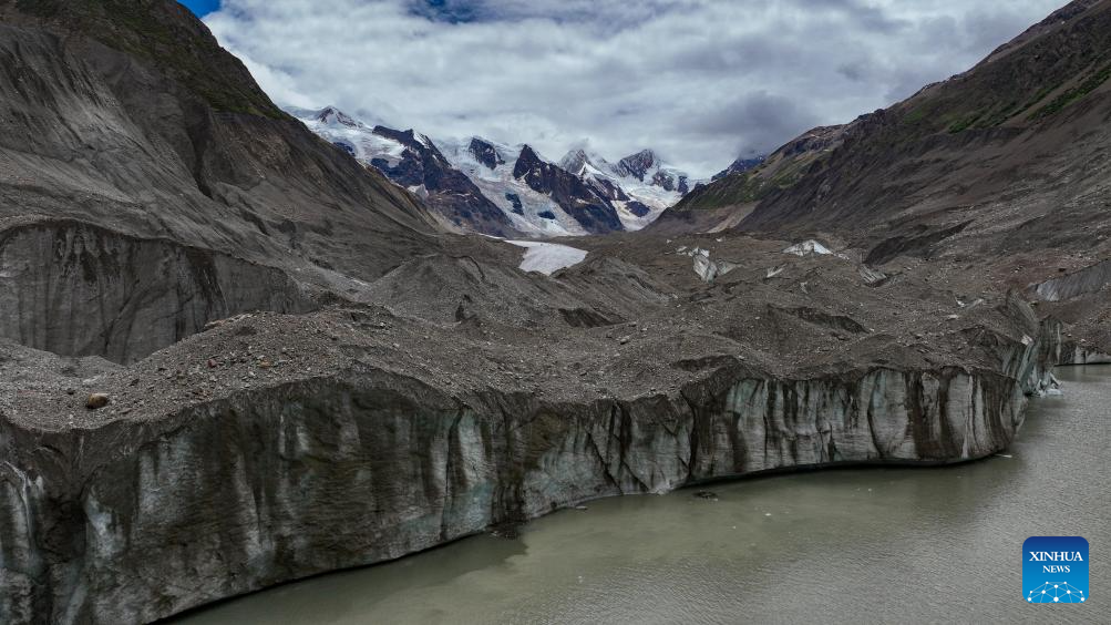 An aerial photo taken on July 20, 2025 shows the end of a glacier tongue of the Jang Khyi La Glacier in Banbar County of Qamdo City, southwest China's Xizang Autonomous Region. Located on the southern foot of the Nyainqentanglha Range, Banbar County sits at an average altitude of 3,500 meters, with its highest point exceeding 5,500 meters. Jang Khyi La Glacier, situated in Banbar County, serves as a primary water source for the tributaries of the upper Nujiang River and neighbors the "three-color lake," a popular scenic site in the county. (Xinhua/Jigme Dorje)