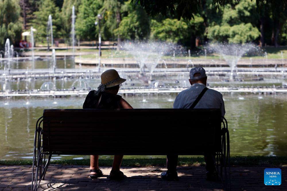 People sit on a bench in the shade during a hot summer day at a park in Bucharest, Romania, on July 22, 2025. Romania's National Meteorological Administration (ANM) issued multiple weather alerts on Tuesday as the country braces for a combination of extreme heat and unstable atmospheric conditions. The national weather agency warned of red code alerts, the highest level in its color-coded warning system, for scorching heat in the capital city of Bucharest and several southern counties. Temperatures there are expected to reach 40 to 41 degrees Celsius, with high humidity leading to severe thermal discomfort. (Photo by Cristian Cristel/Xinhua)