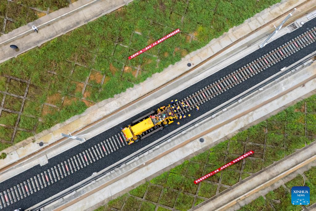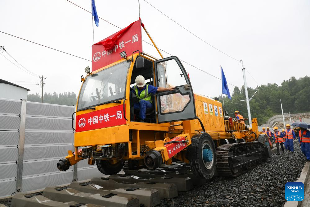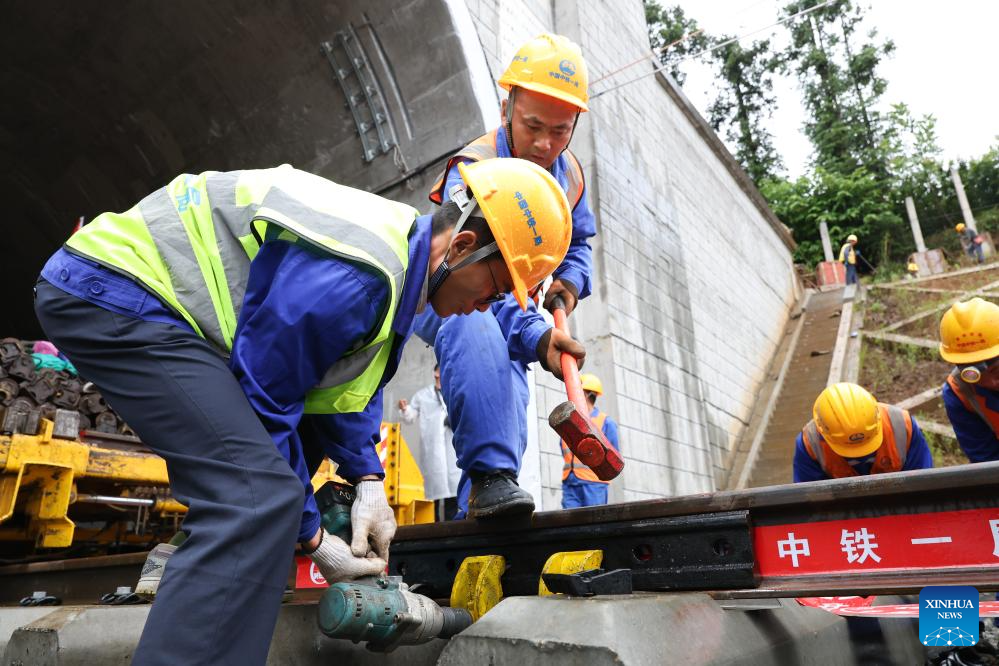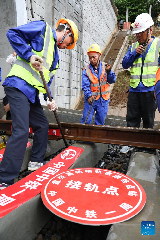 Workers lay railway tracks in Panzhou, southwest China's Guizhou Province, July 22, 2025. With the last 500-meter-long steel rail laid on the roadbed in Panzhou City, the Panzhou to Xingyi high-speed railway's track laying work has been completed on Tuesday. The 98-kilometer railway is expected to open to traffic by the end of 2025, enabling a direct connection from Guiyang to Xingyi within two hours. (Xinhua/Liu Xu)