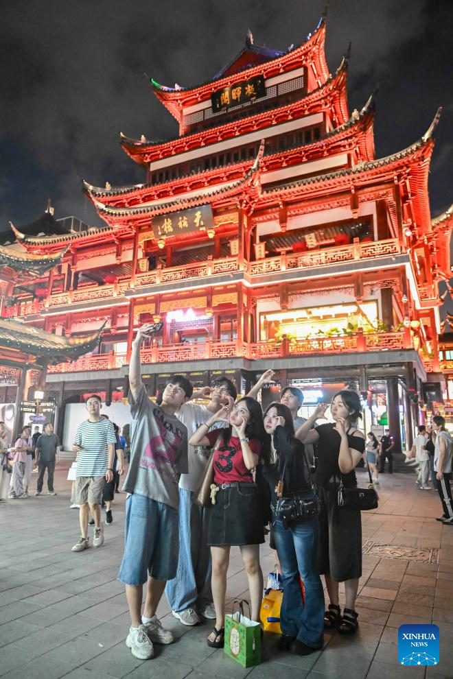 Tourists from Spain take a selfie at Yuyuan Garden Mall in Shanghai, east China, July 21, 2025. Thanks to China's visa-free policies and related measures, the popularity of both travel and shopping in China among foreigners has risen, serving as a boost to the country's tourism development.