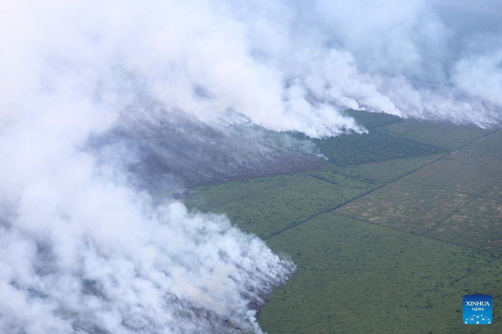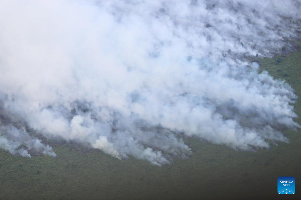 This photo taken from a helicopter on July 21, 2025 shows smokes of a forest and peatland fire in Rokan Hilir regency, Riau province, Indonesia. Indonesian authorities announced that the country's western region is currently on high alert for forest and land fires, with Riau province reporting the highest number of hotspots. Indonesia's National Disaster Management Agency (BNPB) said Monday that forest and land fires have been the dominant type of disaster in the Southeast Asian country since early July. Of the 42 disasters recorded so far this month, 33 are forest and land fires. (BNPB/Handout via Xinhua)