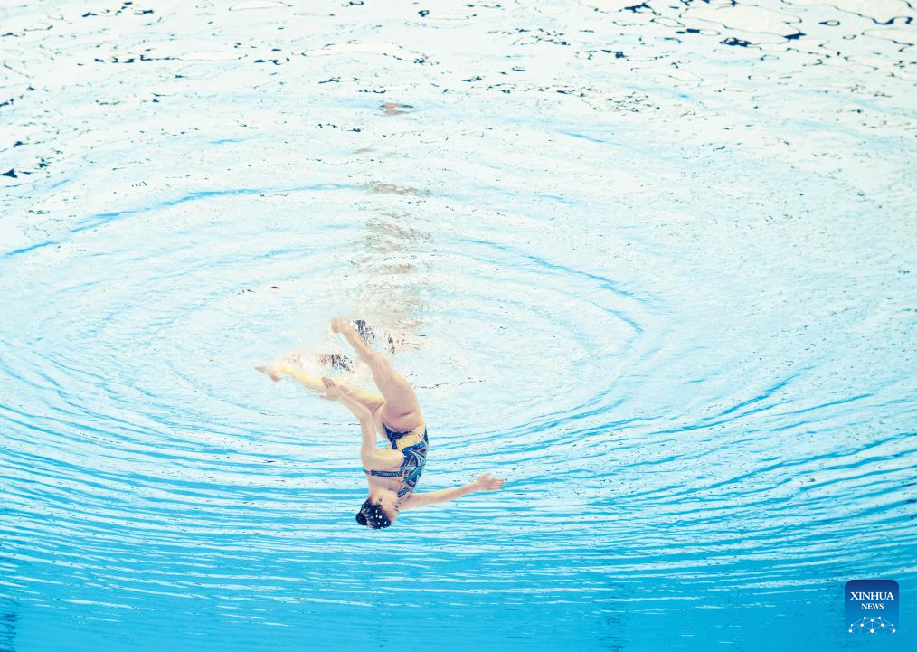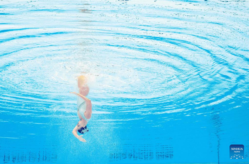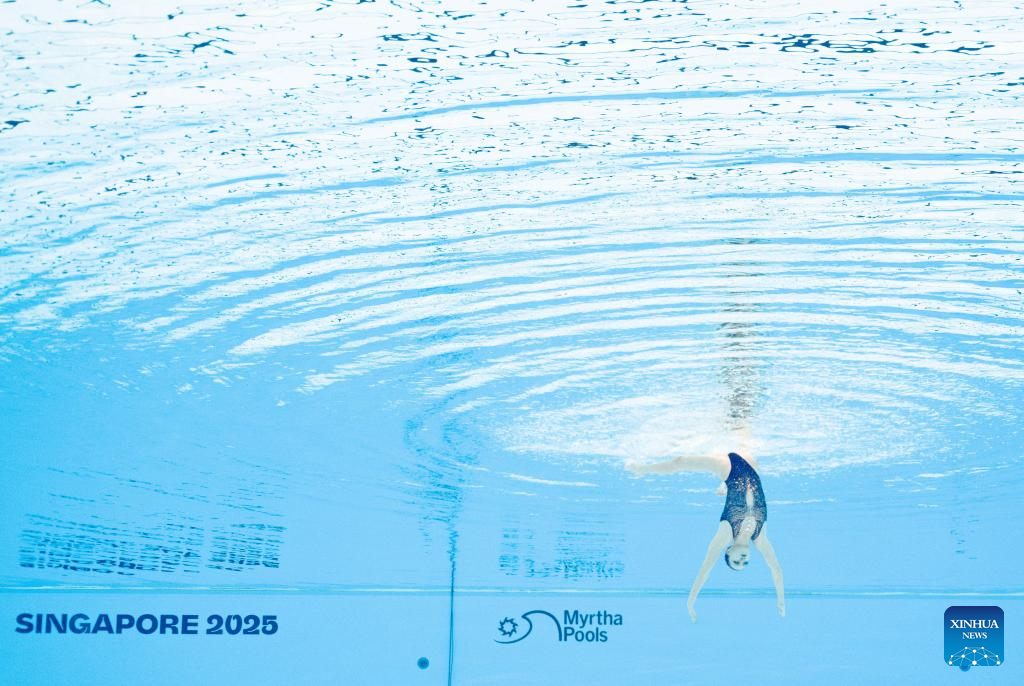 Photo rotated 180 degrees shows Iris Tio Casas of Spain performing during the women's solo free final of artistic swimming at the World Aquatics Championships in Singapore, July 22, 2025. (Xinhua/Xue Yuge)