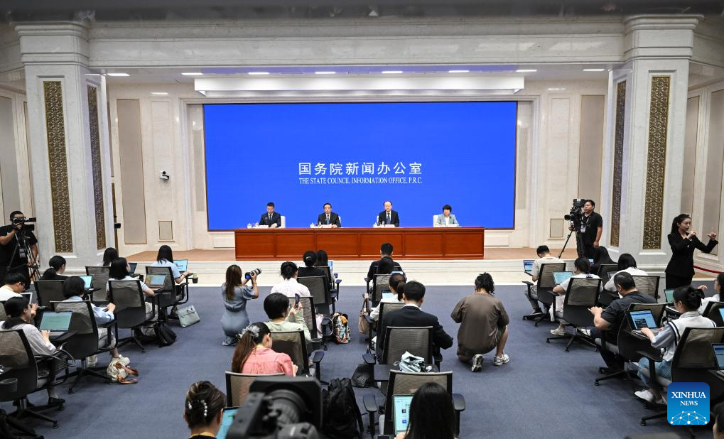 Cheng Kai, chairman of the China Disabled Persons' Federation, Zhou Changkui, secretary of the Communist Party of China leading group of the federation and chairperson of the board of executive directors of the federation, and Li Dongmei, vice chairperson of the federation, attend a press conference held by the State Council Information Office on the achievements in developing the cause of people with disabilities during the 14th Five-Year Plan period (2021-2025), in Beijing, capital of China, July 22, 2025. (Xinhua/Chen Yehua)