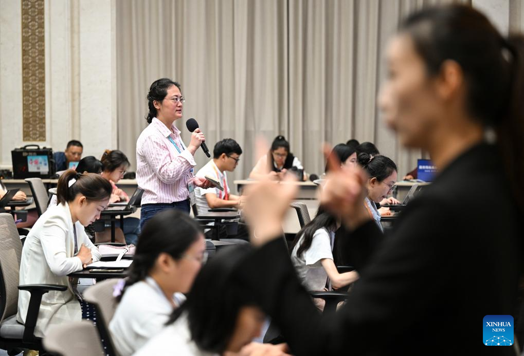 A journalist asks questions at a press conference held by the State Council Information Office (SCIO) in Beijing, capital of China, July 22, 2025. Cheng Kai, chairman of the China Disabled Persons' Federation, Zhou Changkui, secretary of the Communist Party of China leading group of the federation and chairperson of the board of executive directors of the federation, and Li Dongmei, vice chairperson of the federation, attended a press conference held by the State Council Information Office on the achievements in developing the cause of people with disabilities during the 14th Five-Year Plan period (2021-2025) in Beijing on Tuesday. (Xinhua/Chen Yehua)