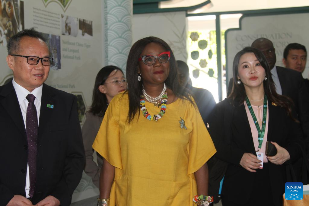 Musonda Mumba (C), secretary general of the Convention on Wetlands, visits the Chinese pavilion ahead of the 15th Meeting of the Conference of the Contracting Parties to the Ramsar Convention on Wetlands (COP15) in Victoria Falls, Zimbabwe, July 23, 2025.(Xinhua/Tafara Mugwara)