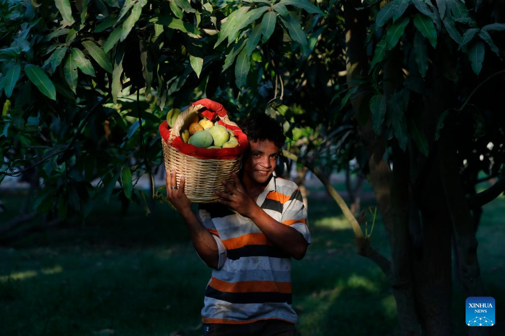 A farmer carries newly-harvested mangoes at a farm in Ismailia Governorate, Egypt, on July 22, 2025. Mangoes have entered harvest season in Egypt. (Xinhua/Ahmed Gomaa)