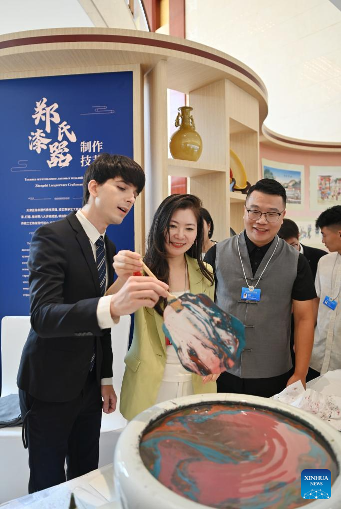 Attendees of the Inter-Civilizational Dialogue Among Shanghai Cooperation Organization (SCO) Countries 2025 learn to dye a traditional Chinese fan with floating lacquer during an exhibition of intangible cultural heritages in north China's Tianjin, July 23, 2025. The event attracted some 300 participants from home and abroad. Sideline events including a calligraphy exhibition, a sculpture exhibition, and an intangible heritage exhibition were also held during the dialogue. (Xinhua/Li Ran)