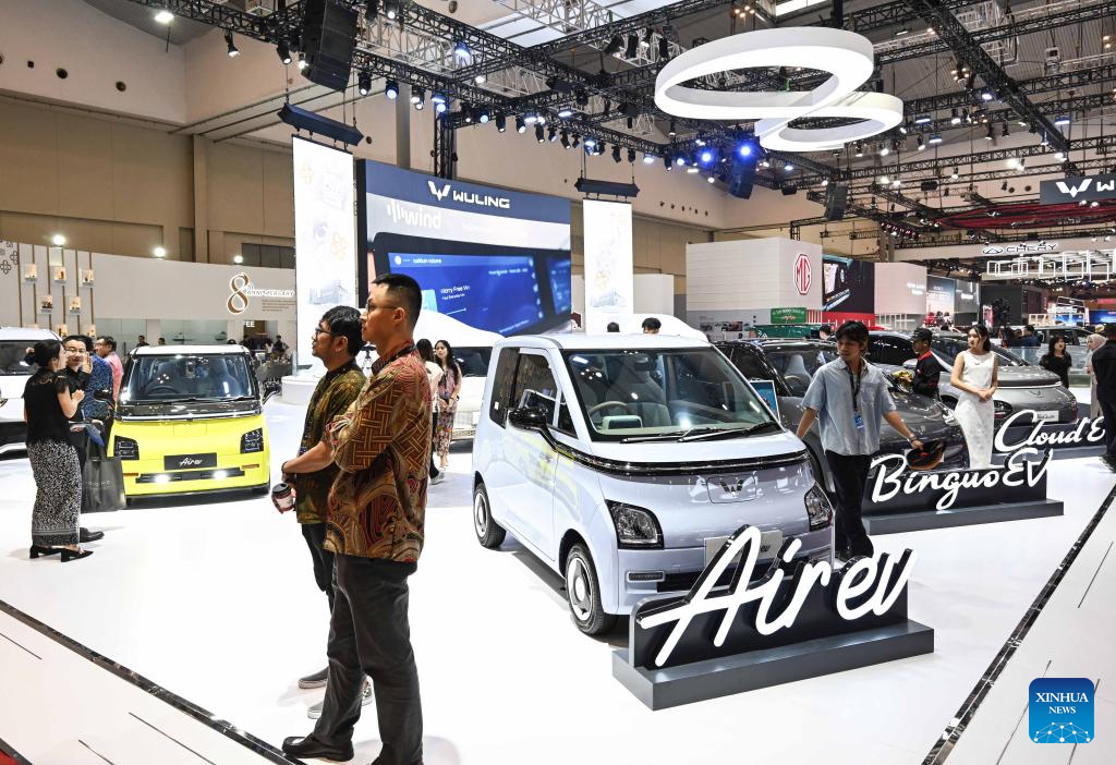 People visit the booth of Chinese auto brand Wuling during the exclusive media day of GAIKINDO Indonesia International Auto Show (GIIAS) 2025 at the Indonesia Convention Exhibition in Tangerang, Banten Province, Indonesia, July 23, 2025. The 32nd GIIAS will open to the public from July 24 to Aug. 3. (Xinhua/Agung Kuncahya B.)