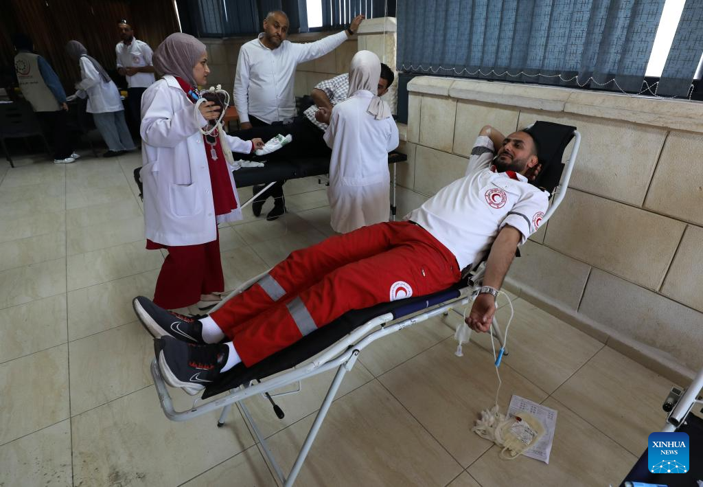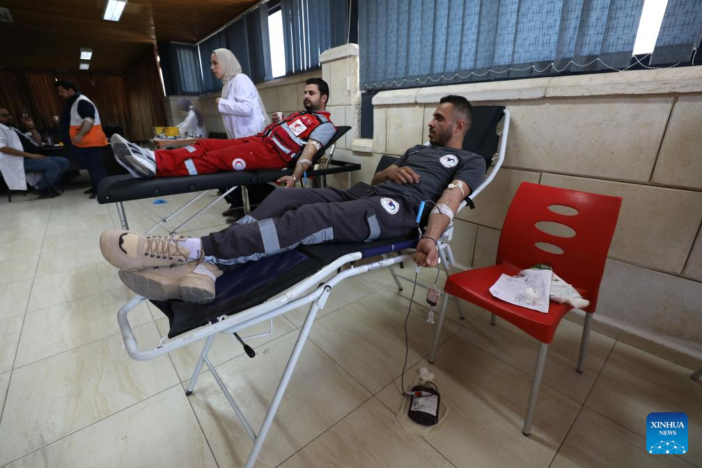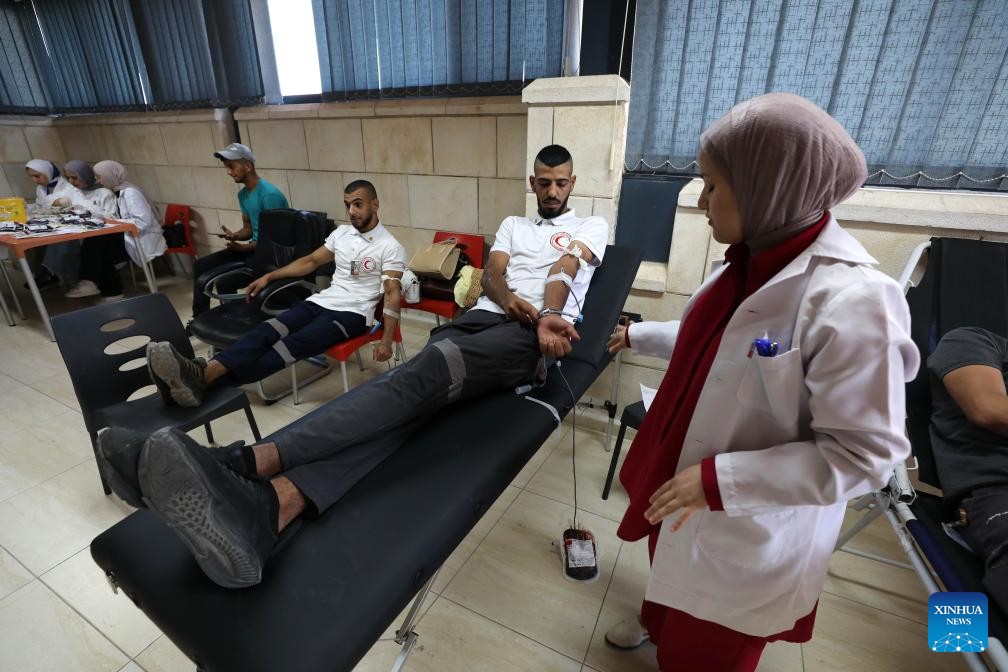 People participate in a blood donation campaign in support of Gaza Strip-based Palestinians in the northern West Bank city of Nablus, on July 23, 2025. (Photo by Nidal Eshtayeh/Xinhua)